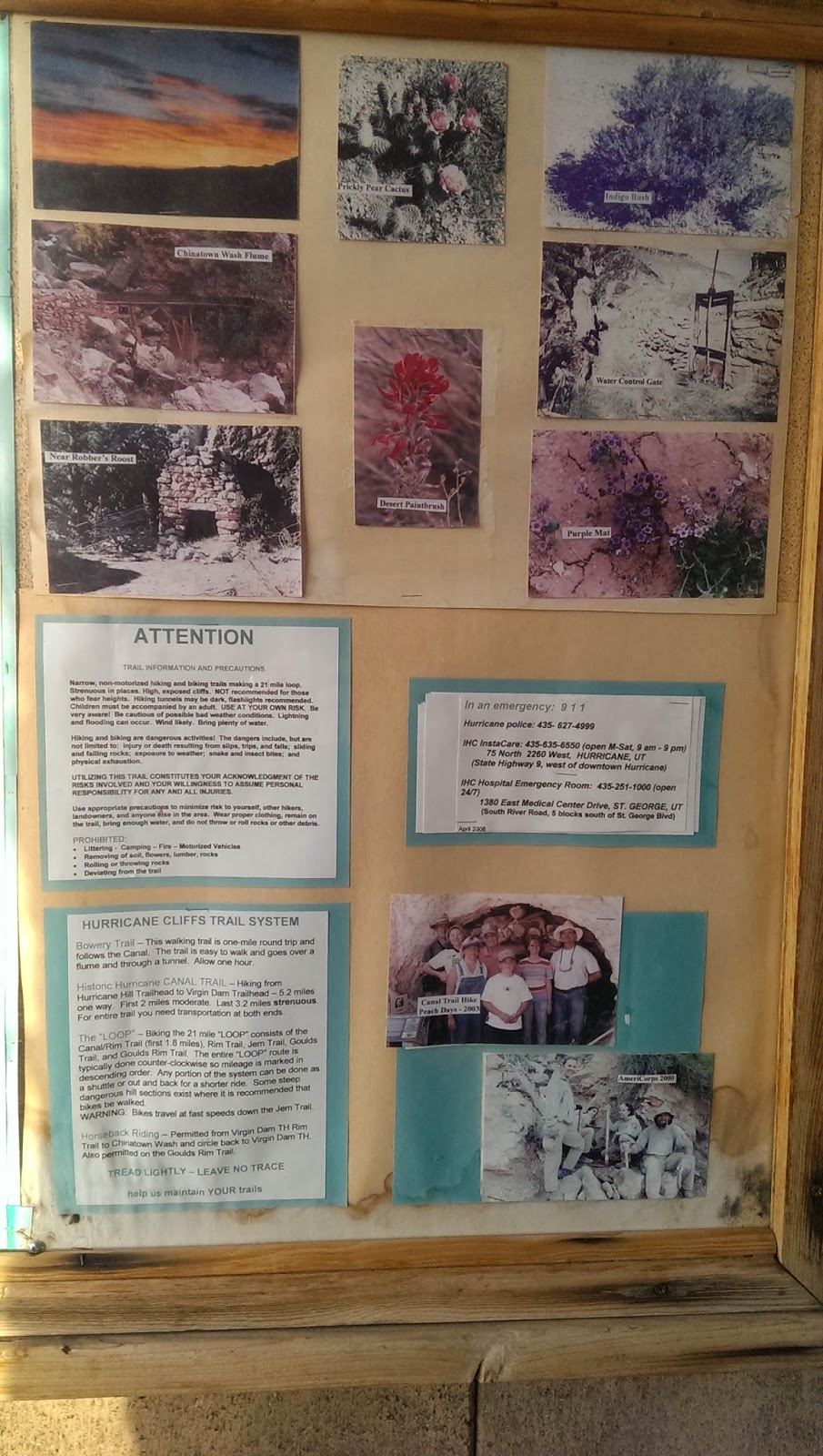 Signs guiding you to the Rim Trail from the Virgin Dam Trailhead parking area